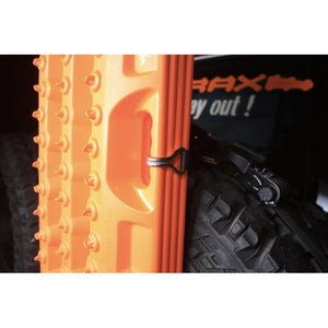 Step 5. Lift the MAXTRAX onto the harness, placing the center handles over the lower arms of the metal hanger, then push the MAXTRAX against the tire. The metal hanger will hold the MAXTRAX in place so that you can complete the next steps using both hands.