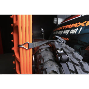WARNING! Before driving, and frequently during your journey (particularly on rough roads and tracks), check that both straps are tight and the MAXTRAX are secure and cannot move.